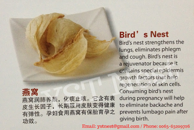 Bird's Nest strengthens the lungs, eliminates phlegm and cough. Bird's nest is a rejuvenator because it contains special epidermis growth factors that help regeneration of skin cells. Consuming bird's nest during pregnancy will help to eliminate backache and prevents lumbago pain after giving birth.